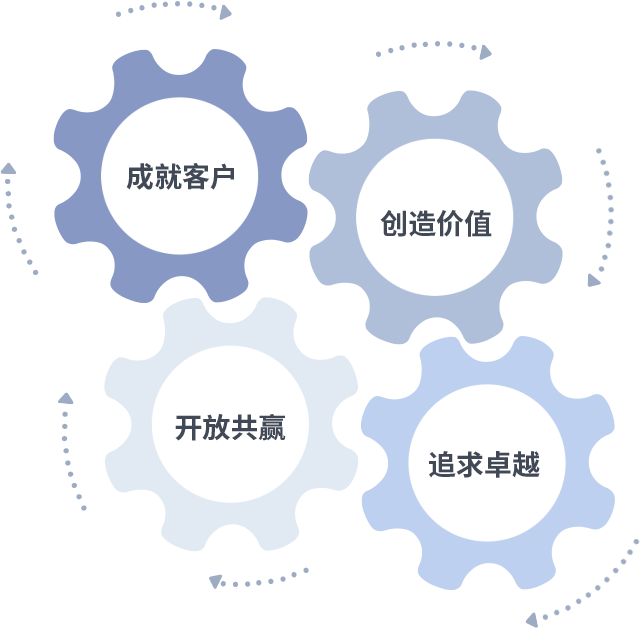 成就客户是一切决策的出发点,创造价值是衡量所有工作的标准,追求卓越是太阳集团tcy8722做事做人的态度,开放共赢是太阳集团tcy8722的格局也是最终的结果。价值观的齿轮环环相扣,推动着组织里的每个人不断向前。